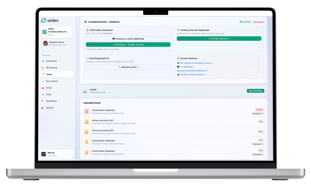 Crea tu empresa online con Aiden en cuestión de horas. Disfruta de asesoramiento en línea y un panel para gestionar tu empresa. Añade nuevas funciones a demanda y accede a ofertas exclusivas