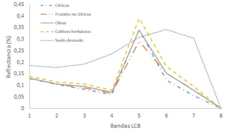 La información ofrecida por un satélite se encuentra agrupada en una serie de bandas espectrales. Son justamente los valores de dichas bandas los que permiten obtener el ADN del objeto, llamado firma espectral, que se quiere estudiar (Fig. 1).