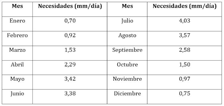 Nuestro estudio ha conseguido, a través de los datos suministrados por los satélites, un aumento de la calidad del fruto. Gracias a la tecnología sabemos que es necesario dejar que el árbol pase sed durante dos o tres días antes de comenzar la recolección. Esto siempre y cuando el riego por goteo de cada planta haya cubierto las necesidades, expresadas como milímetros por día, mostradas en la Figura 2.