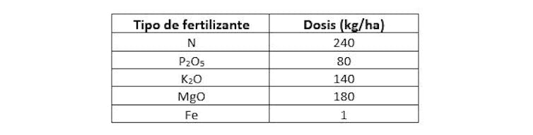 Para procurar unas prácticas agrícolas sostenibles con el medio ambiente, una de las medidas llevadas a cabo fue implantar el siguiente plan de fertilización bajo riego por goteo (Fig. 3). El cálculo de las dosis de abono se obtuvo con el fin de maximizar la producción y minimizar sus gastos.