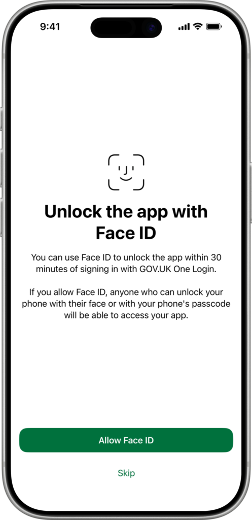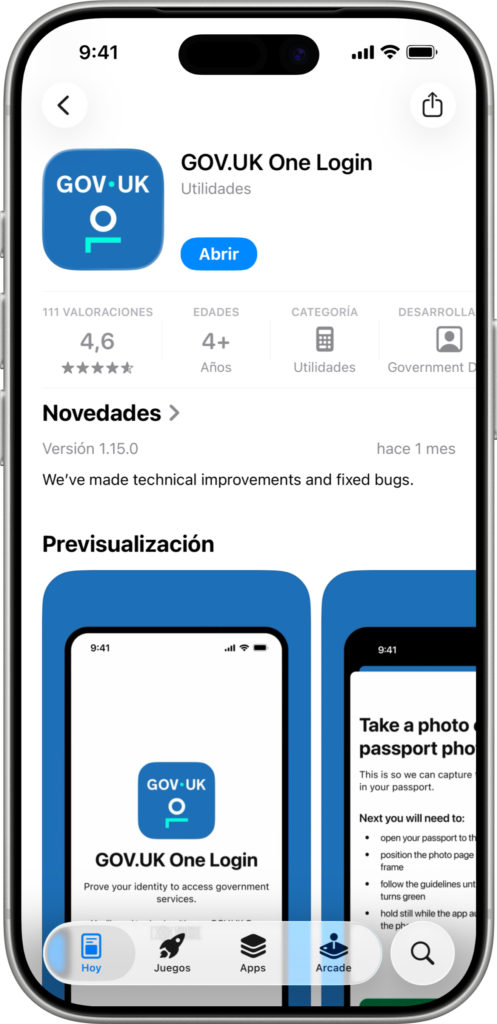 Durante el proceso, el sistema te indicará que utilices tu teléfono móvil para continuar. En este punto se te pedirá descargar la aplicación oficial GOV.UK One Login, disponible para iPhone y Android. El móvil es necesario para completar la verificación.